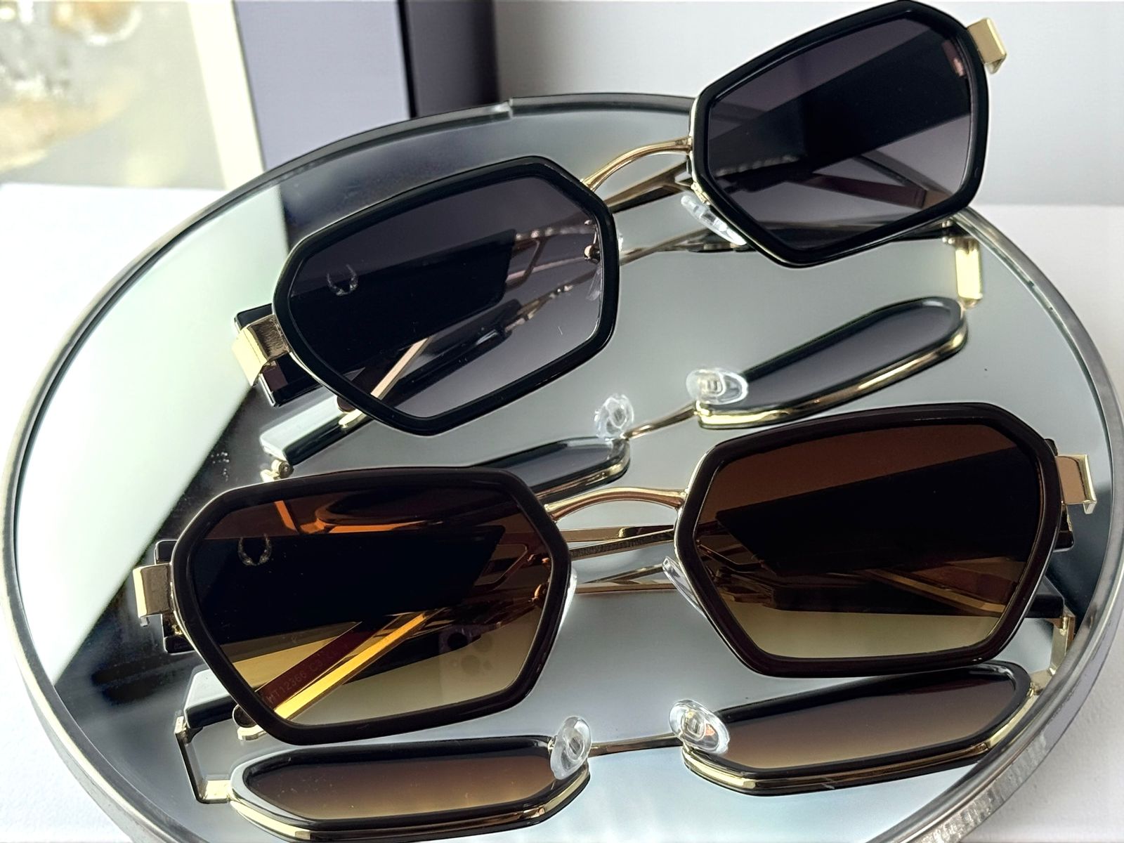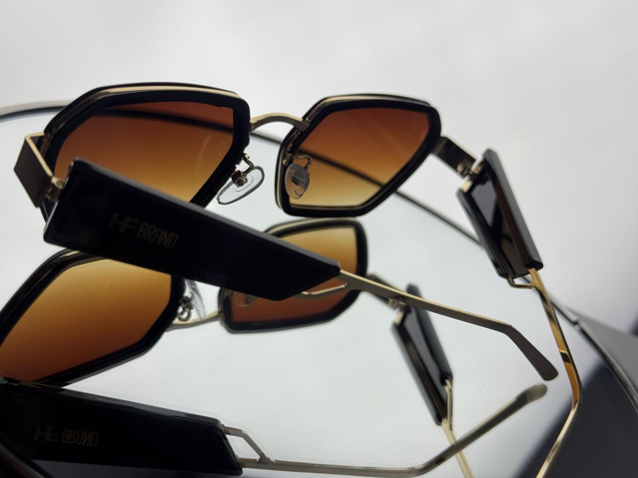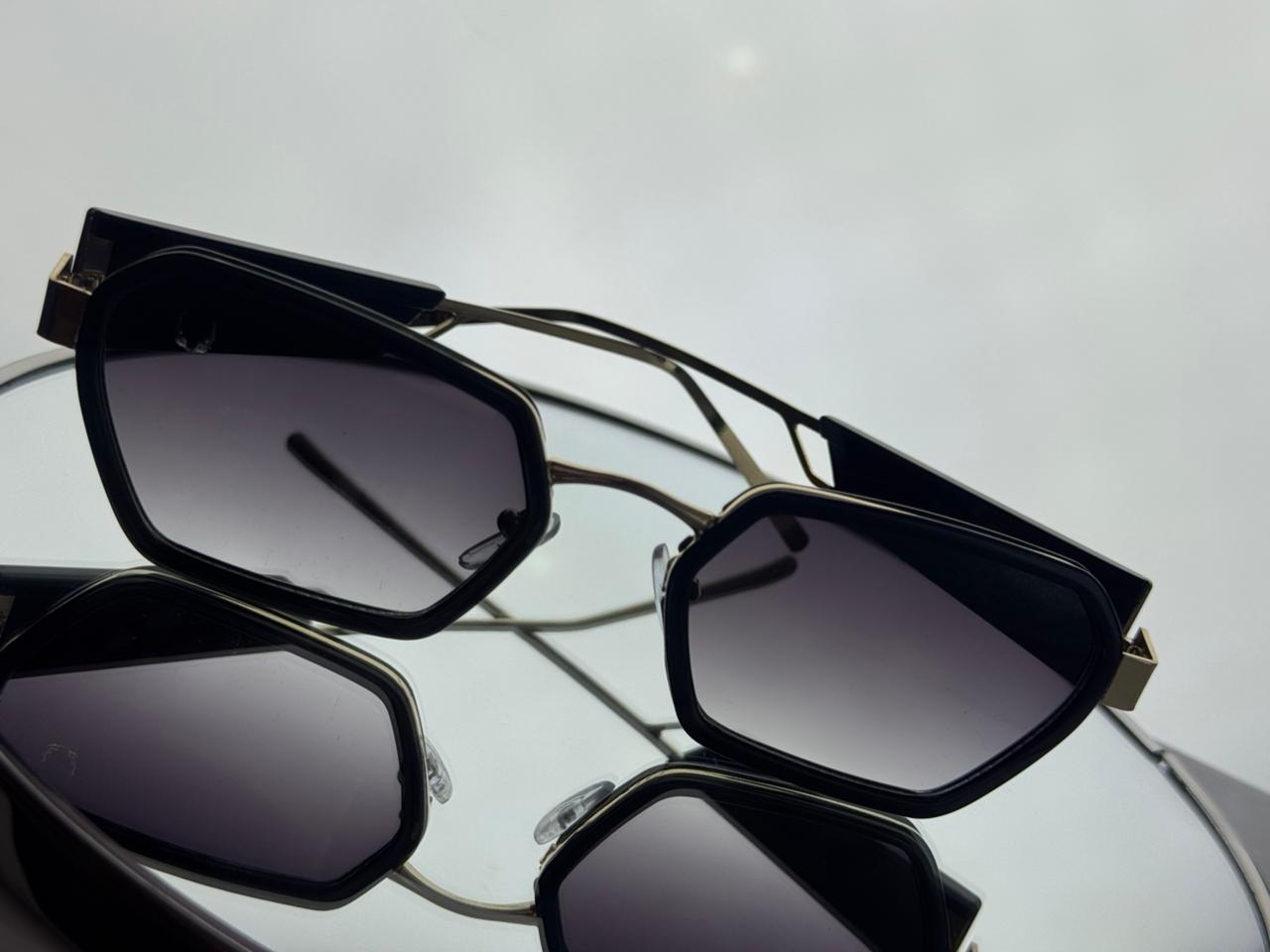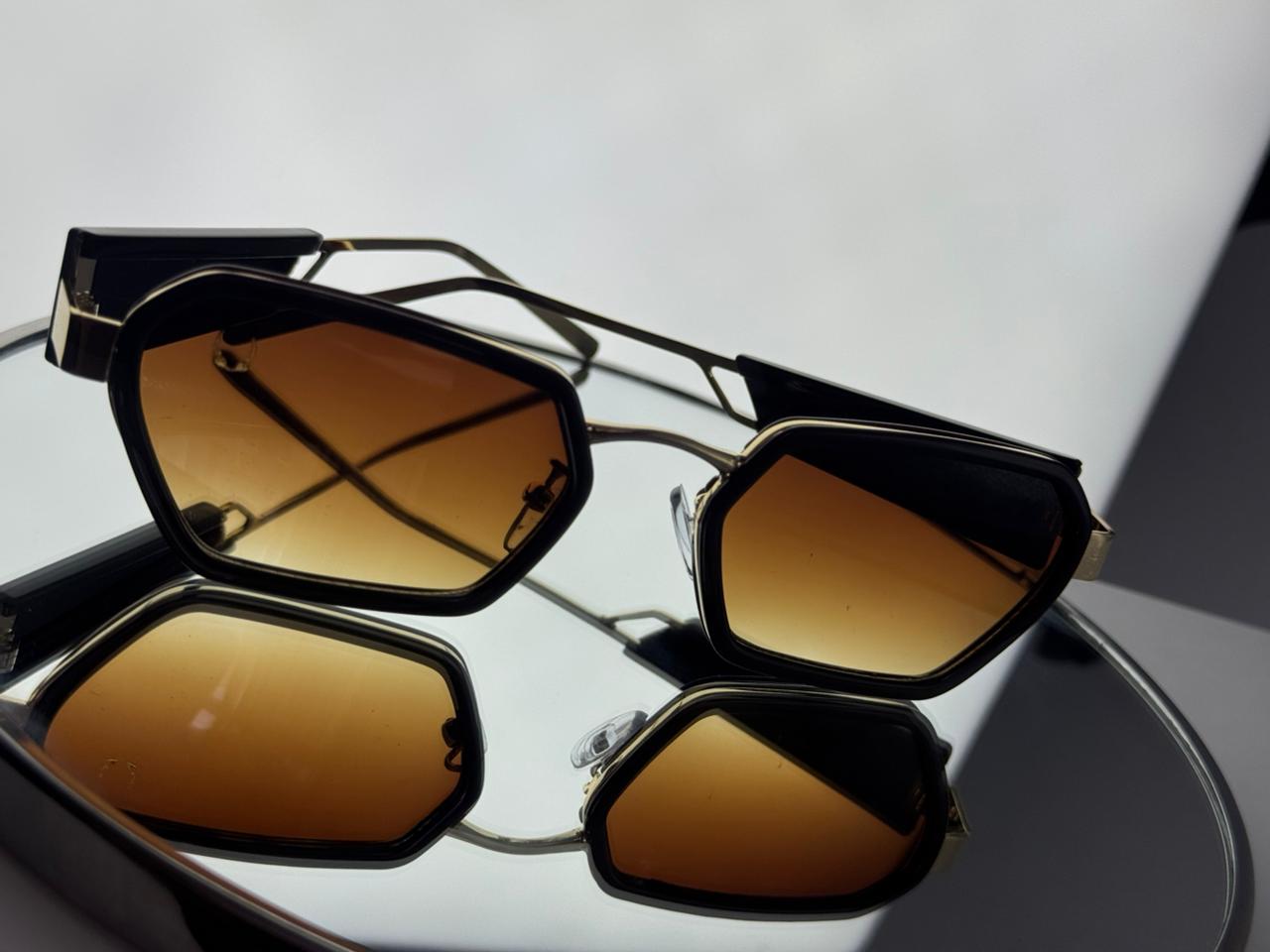 Disponível em duas versões: Marrom degradê e fumê (preto acinzentado). Ambas oferecem proteção UV e um efeito suave de transição, equilibrando estilo e funcionalidade. As lentes têm um formato angular que acompanha o recorte ousado da armação, criando um visual contemporâneo e imponente.