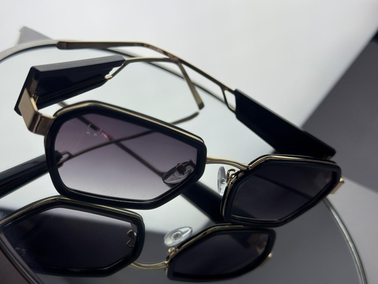 Design geométrico moderno com estrutura metálica dourada e detalhes em preto fosco na parte superior. Possui hastes finas e elegantes, com acabamento sofisticado e ponte dupla que adiciona um toque futurista. A construção é robusta, mas leve, garantindo conforto e presença visual marcante.
