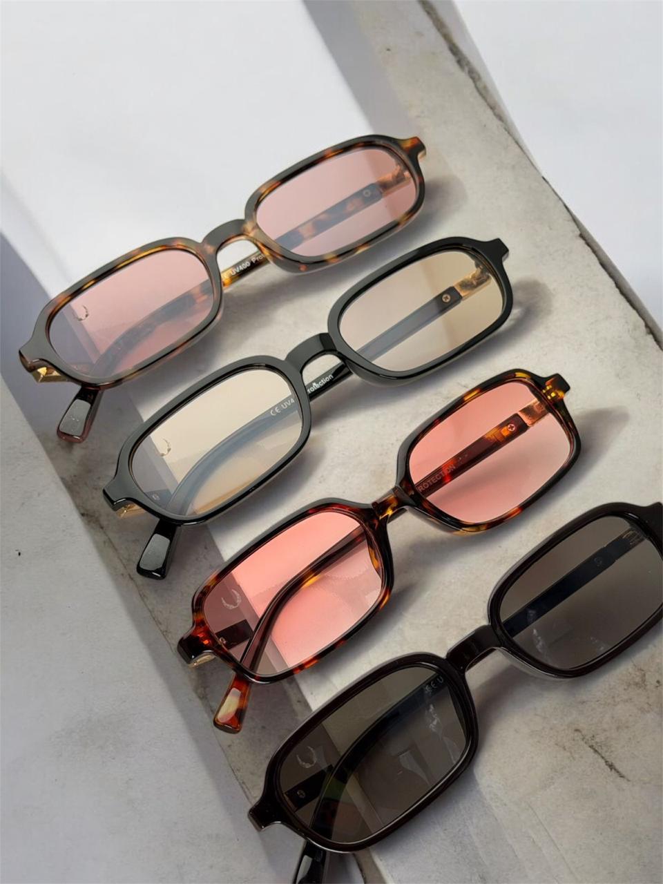 Armação preta/ Lente âmbar, Armação preta/ lente preta, Armação tartaruga/ Lente rosé cereja, Armação tartaruga/ Lente rosé degradê