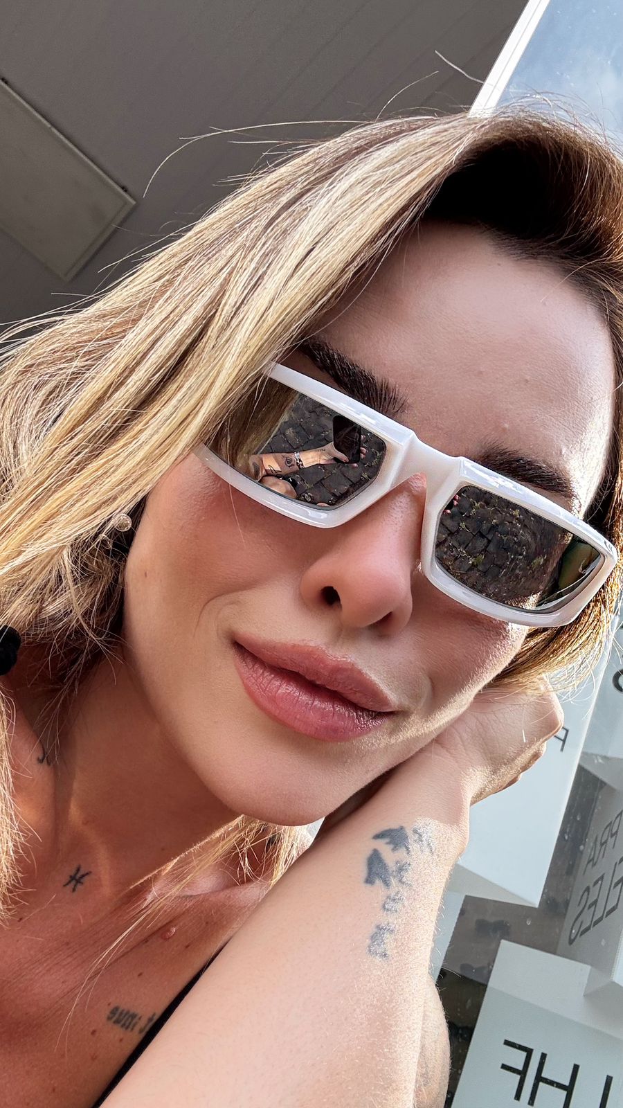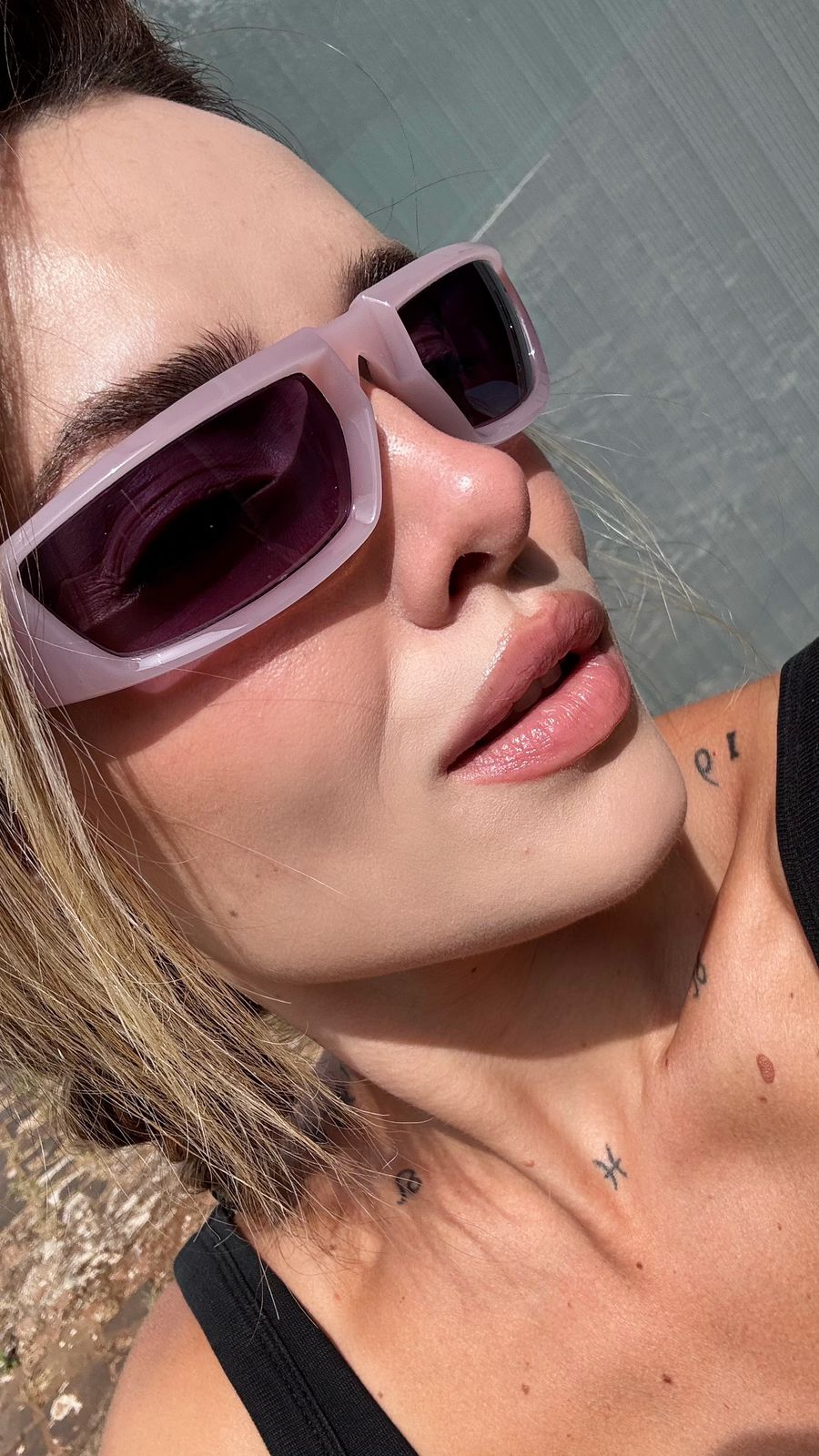 Lentes retangulares e alongadas, contínuas e levemente espelhadas. No rosa a lente tem um degradê puxando para o roxo, no roxo a lente é grafite e uniforme.
