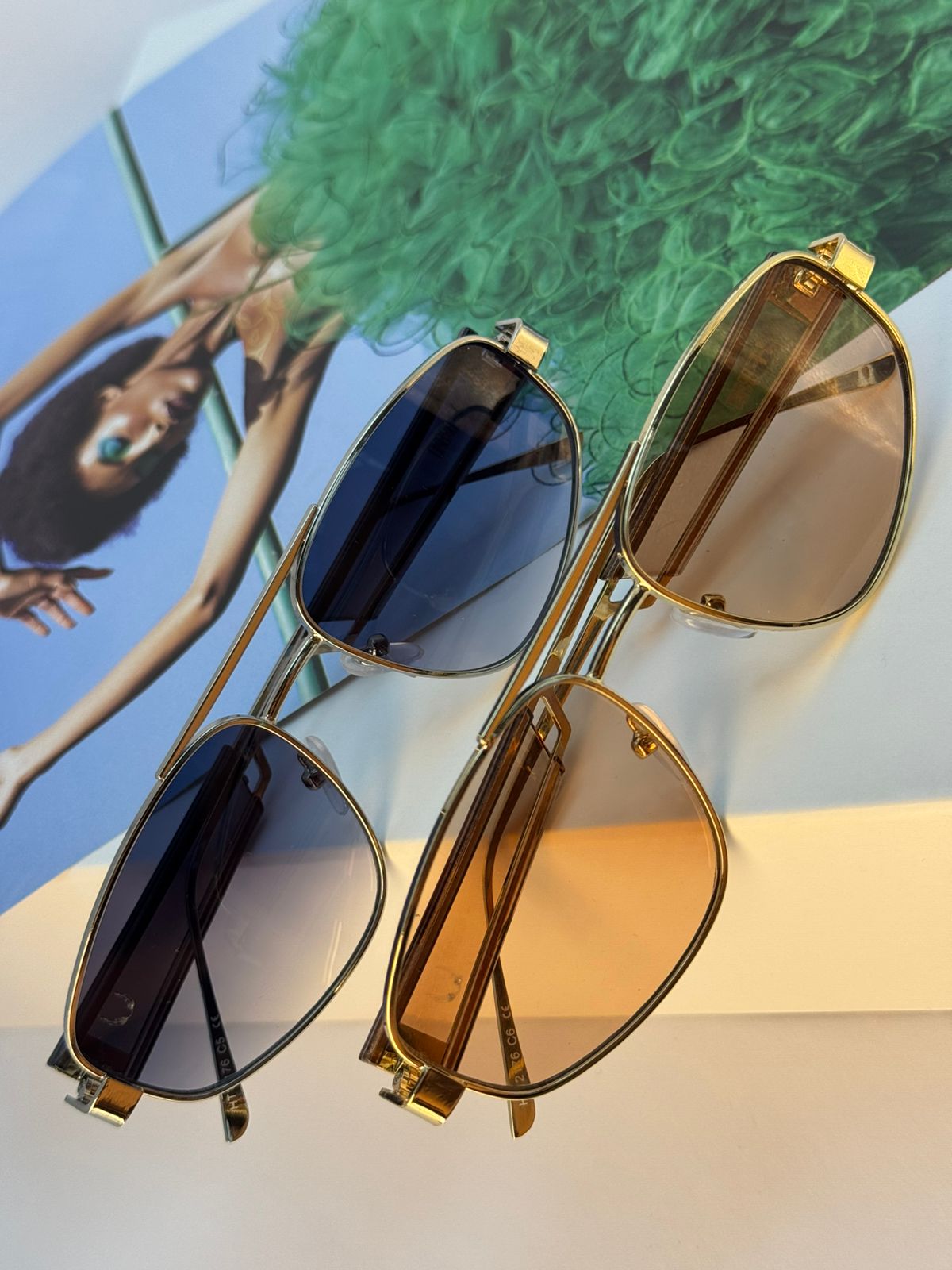 Duas opções de armações: Metálica dourada e metálica prateada, com hastes finas e design estruturado. O detalhe superior em acrílico translúcido traz um toque moderno e sofisticado. A leveza e o brilho conferem elegância atemporal ao modelo.