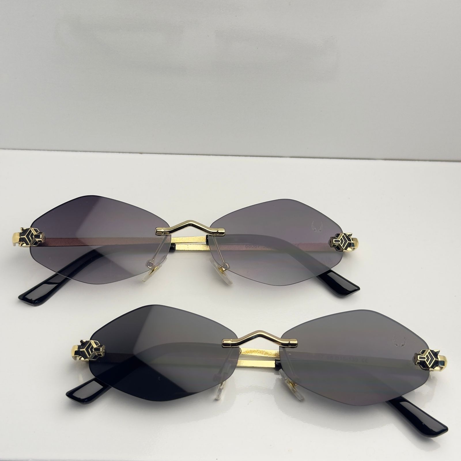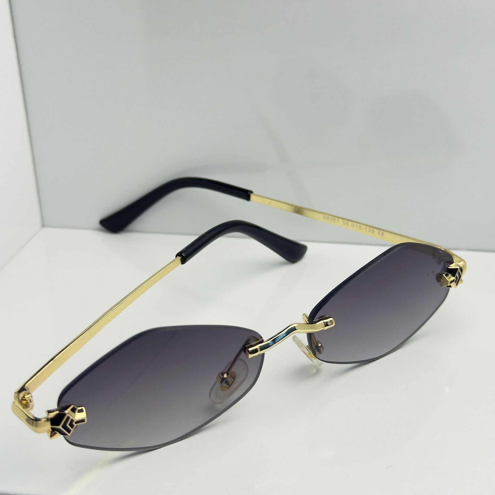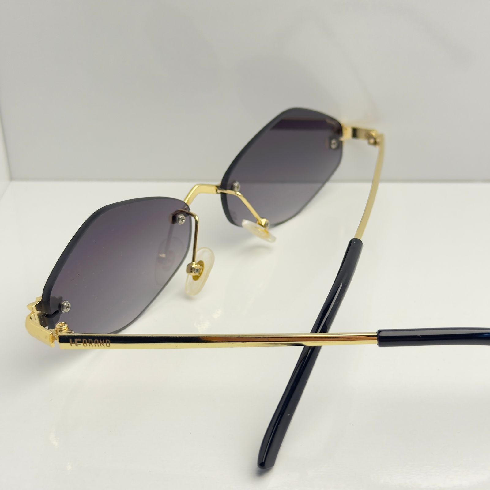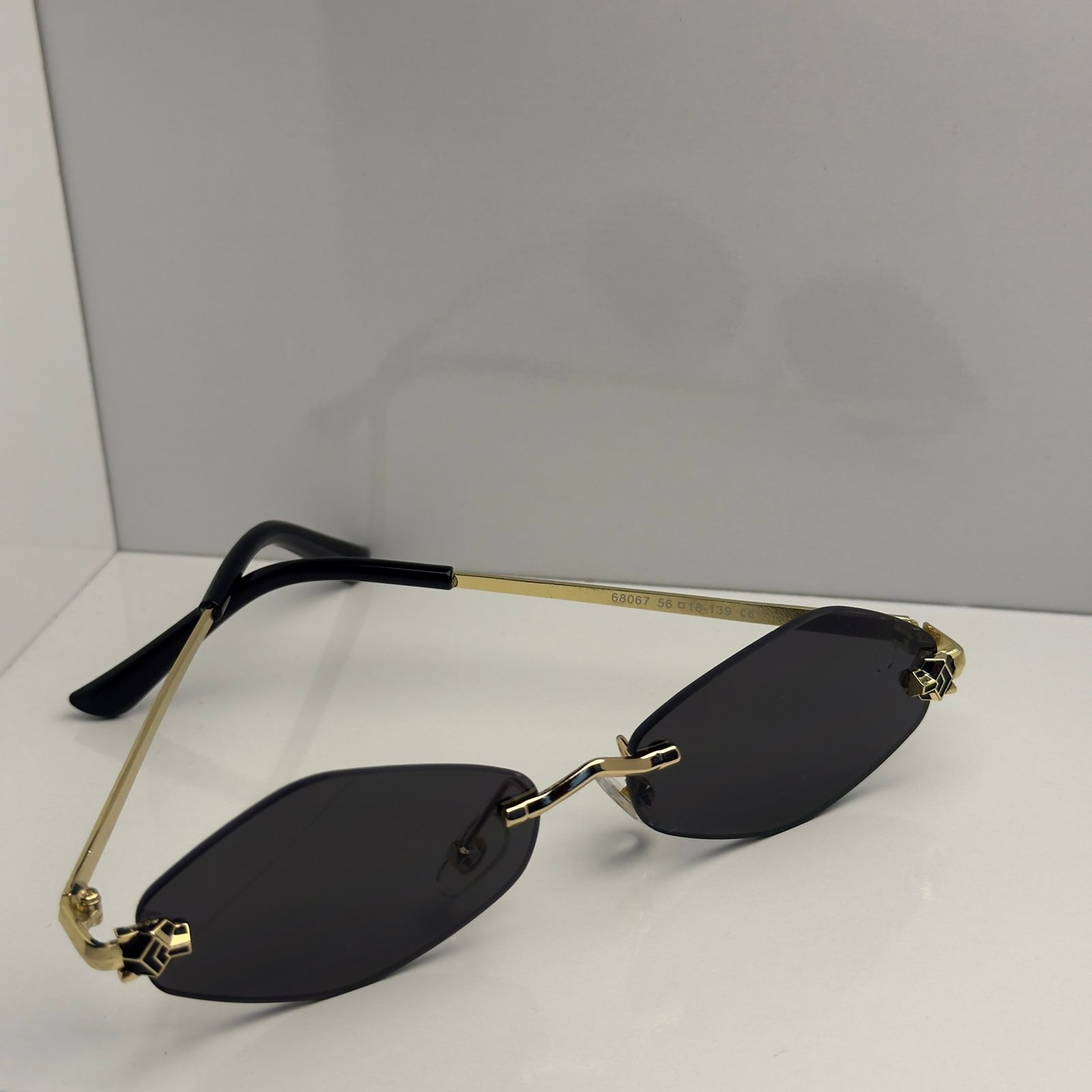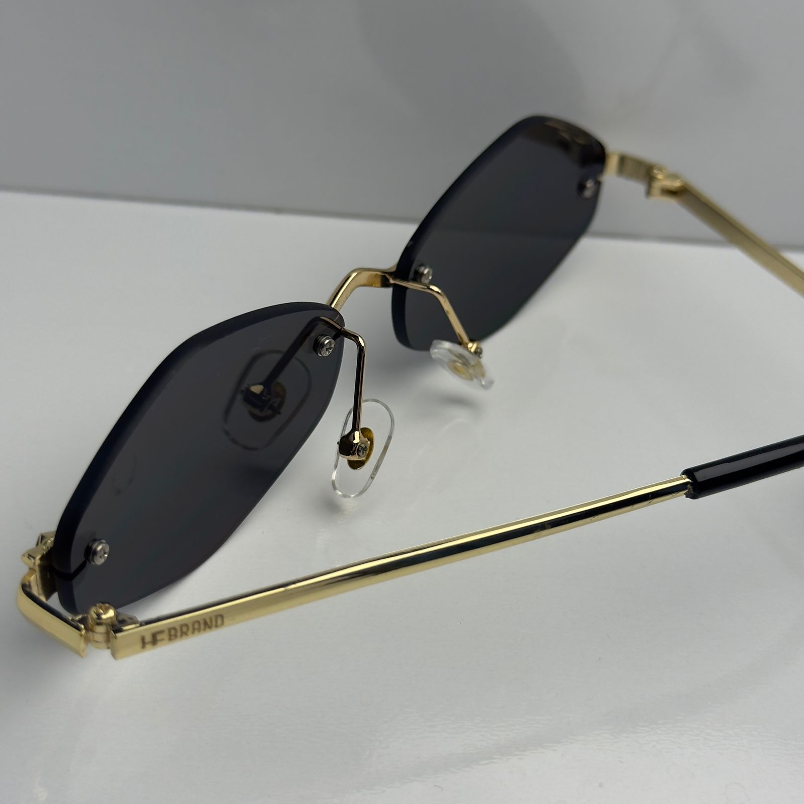 Design rimless (sem aro), com hastes finas em metal dourado polido e ponte moderna em formato angular. As ponteiras são pretas, trazendo conforto e equilíbrio visual. Detalhes geométricos metálicos nas laterais reforçam o estilo de luxo discreto.