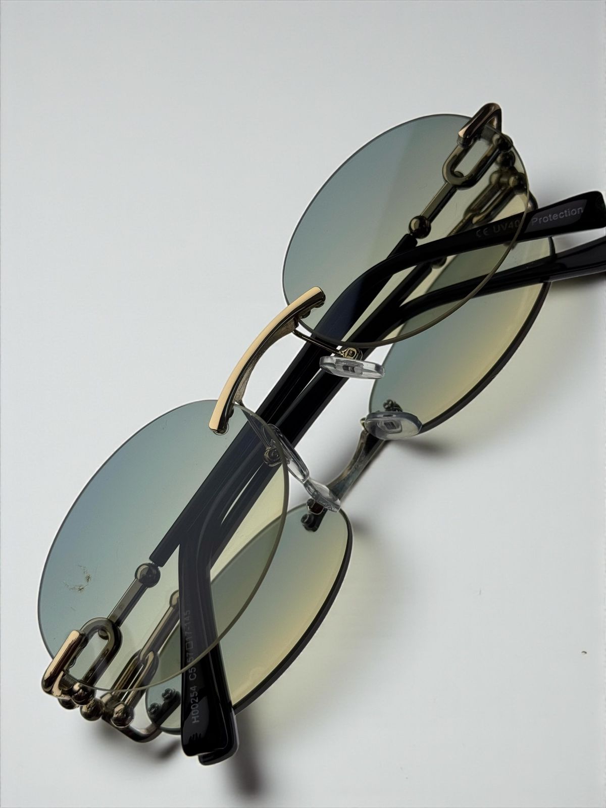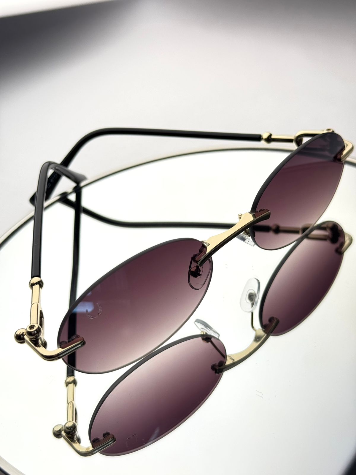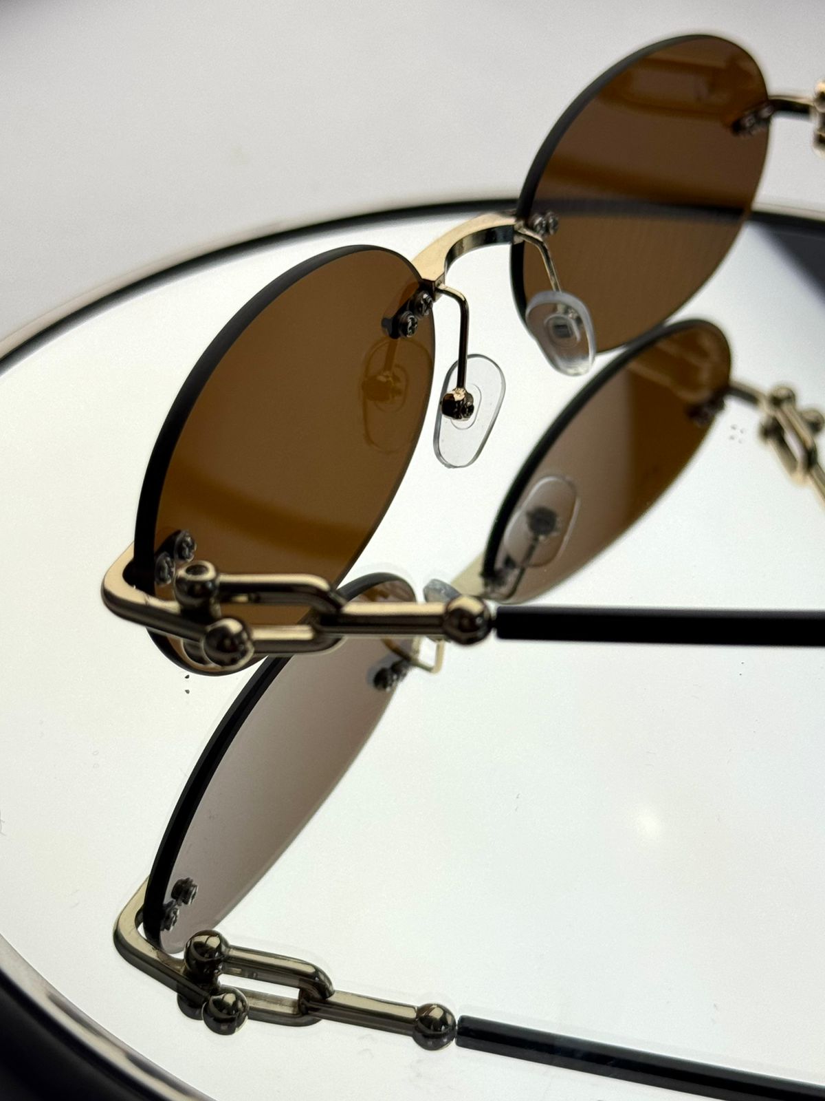 Design sem aro, sustentado apenas pelas hastes metálicas com detalhes em elos dourados, um toque de sofisticação e leveza que remete ao luxo europeu. A ponte em metal dourado confere equilíbrio entre estrutura e fluidez, reforçando o caráter refinado do modelo.