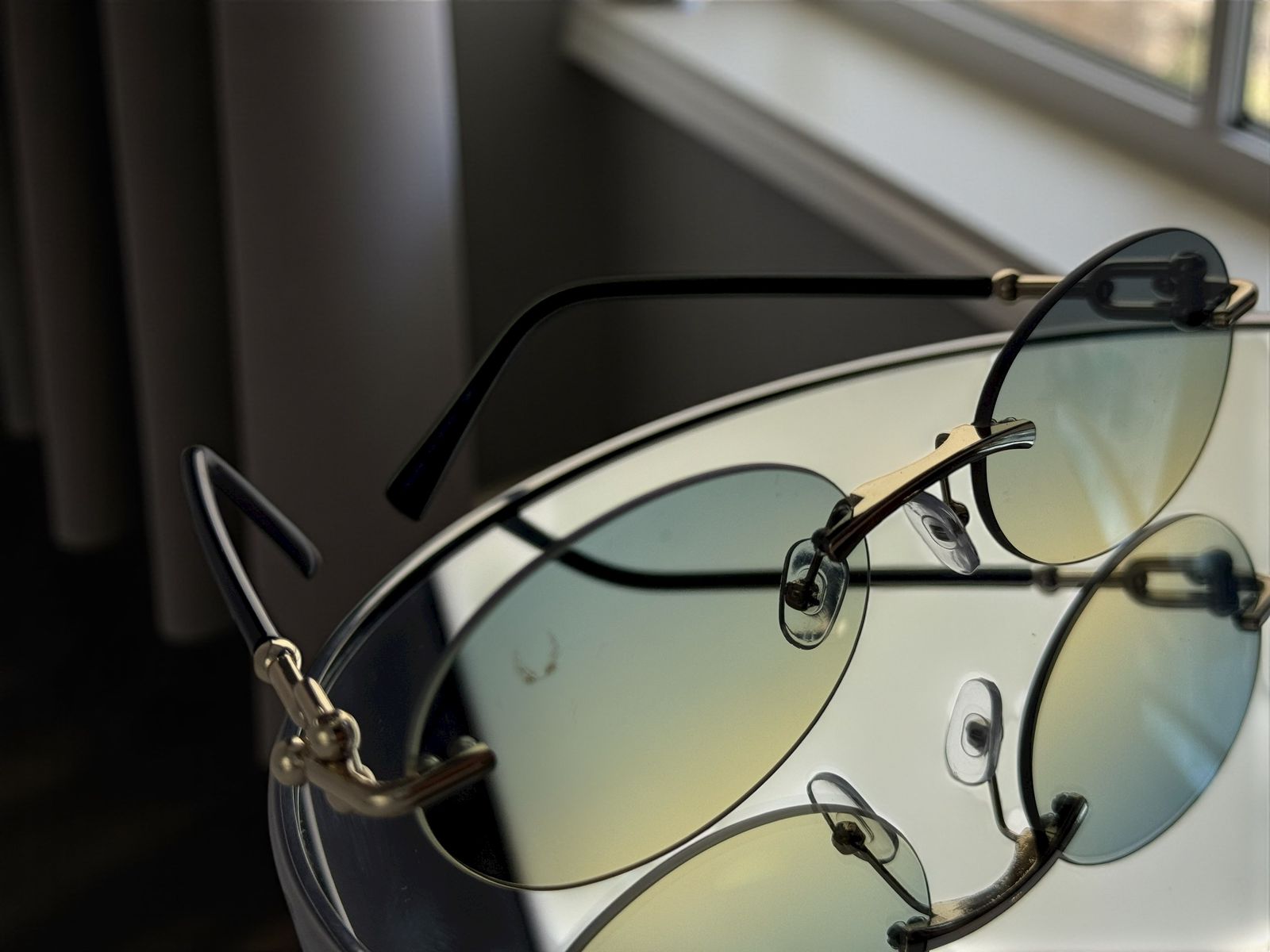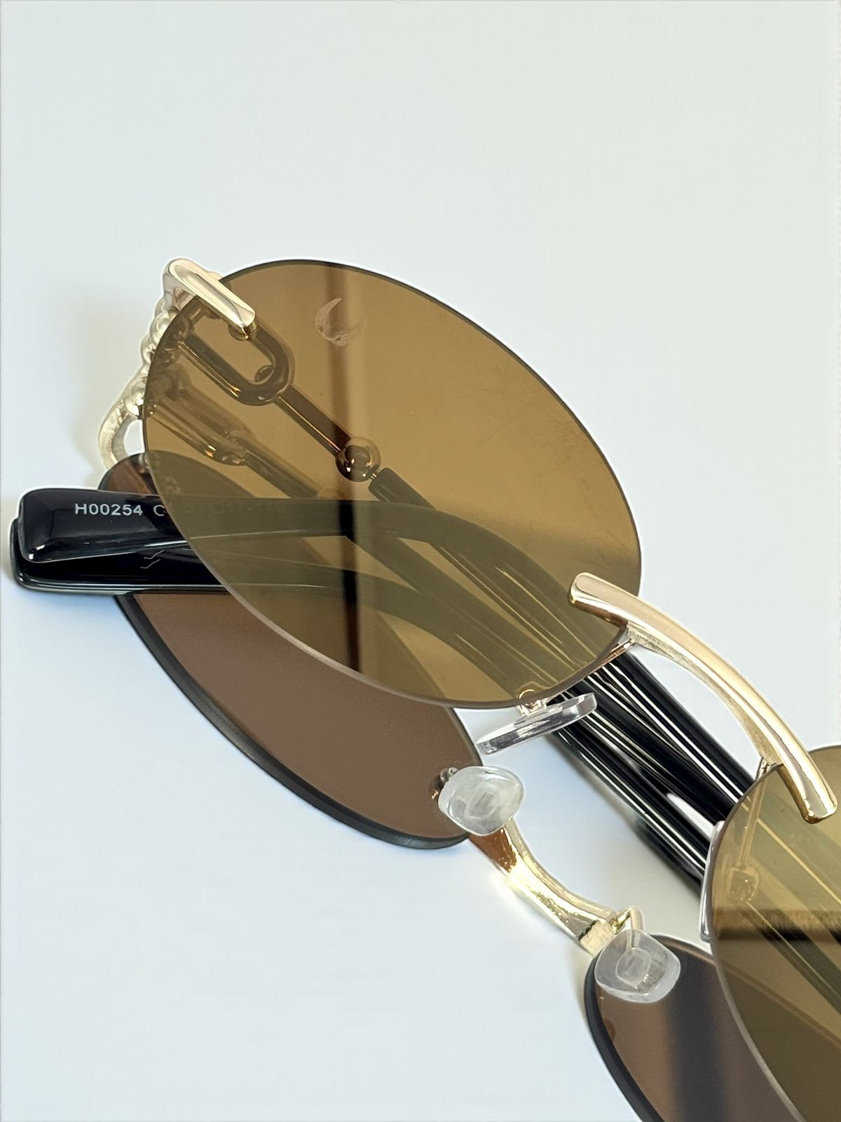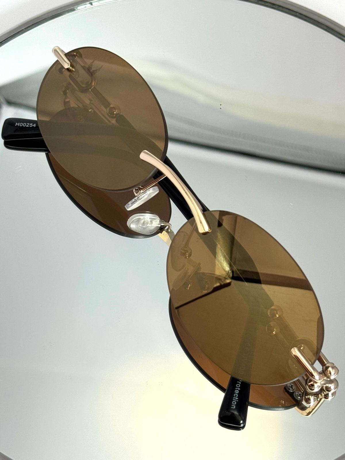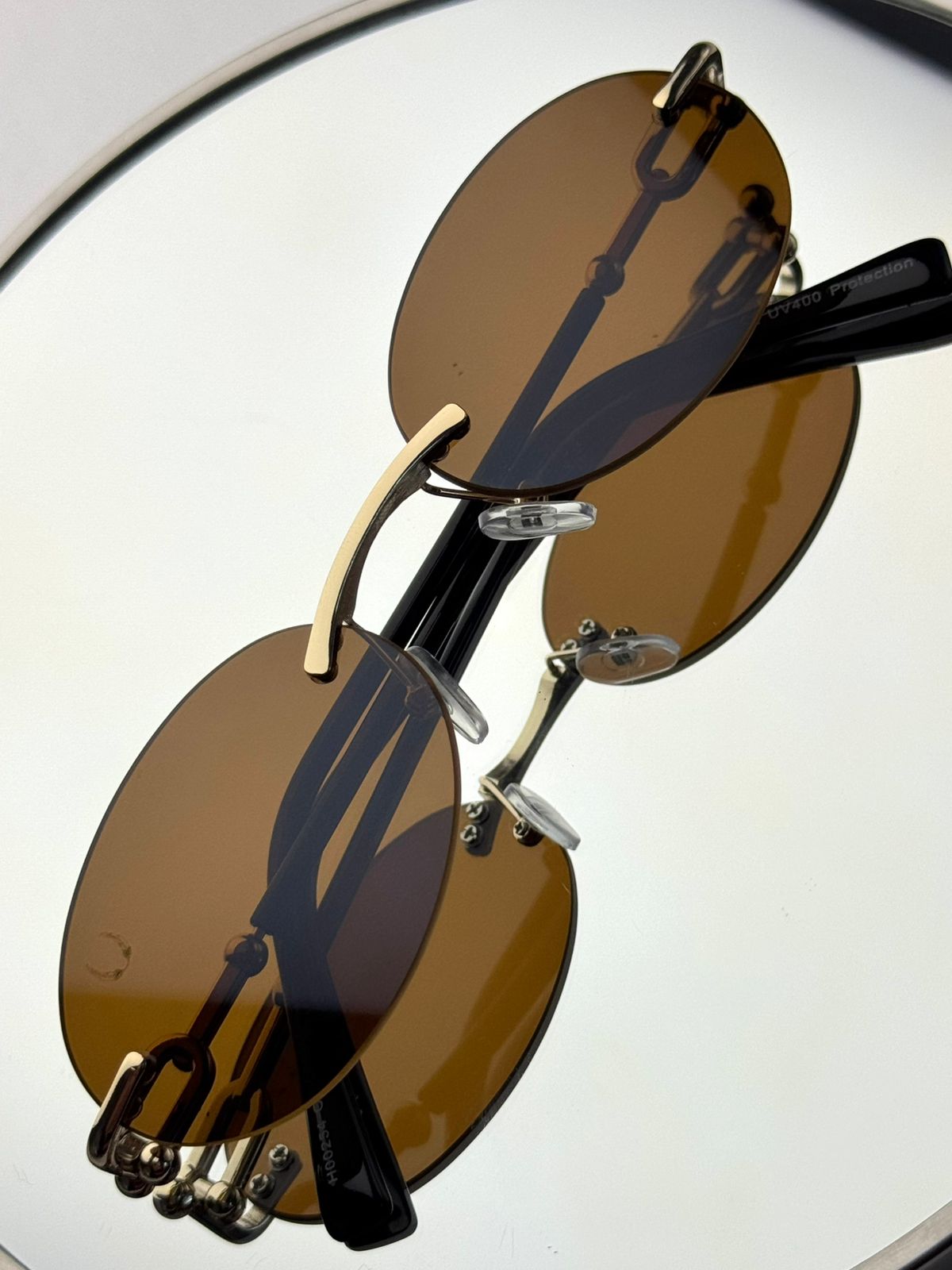 Design sem aro, sustentado apenas pelas hastes metálicas com detalhes em elos dourados, um toque de sofisticação e leveza que remete ao luxo europeu. A ponte em metal dourado confere equilíbrio entre estrutura e fluidez, reforçando o caráter refinado do modelo.
