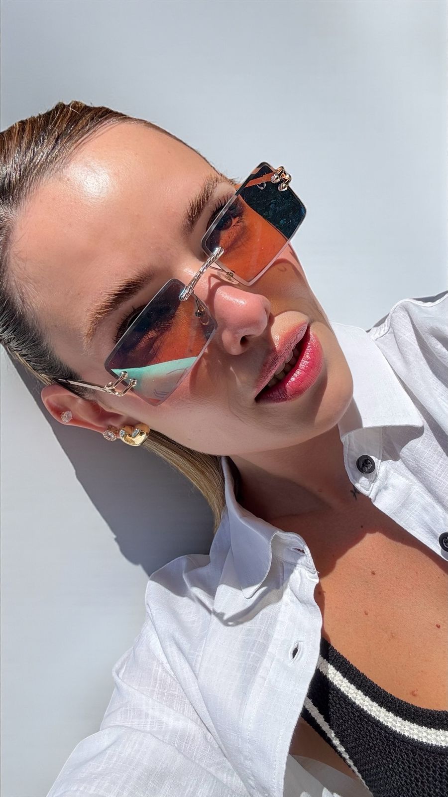 Lente espelhada retangular, em tons que variam entre azul celeste e alaranjado dourado, dependendo da luz e do ângulo. Esse reflexo intenso e vibrante cria um efeito mirror prismático, sofisticado e cheio de personalidade. Além de proteger, reflete luz com estilo, um verdadeiro destaque em qualquer look.
