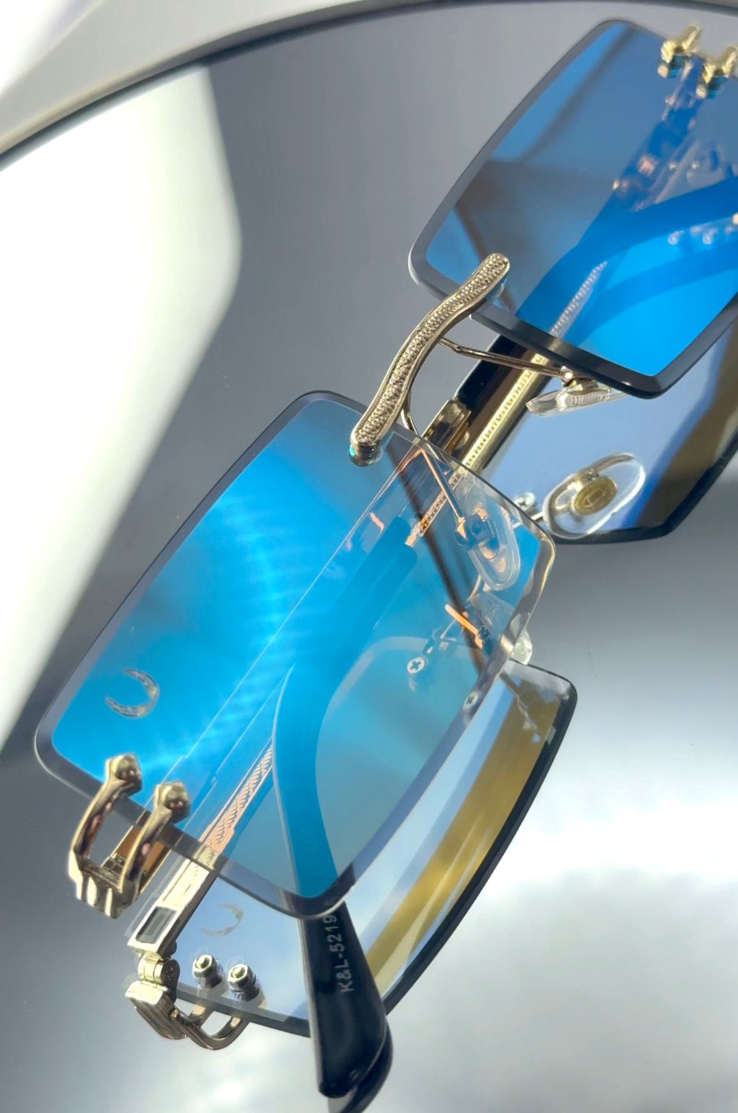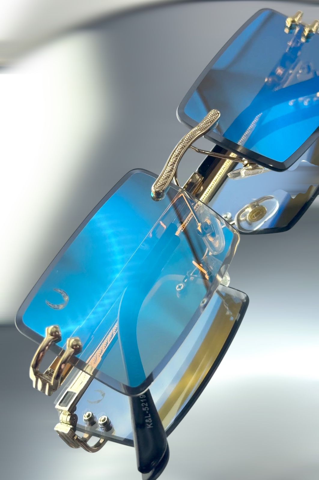 Armação rimless (sem aro) com estrutura metálica dourada e hastes finas em formato levemente curvado. O detalhe texturizado nas hastes e nas ponteiras dá um toque de luxo e exclusividade. O design é leve, moderno e elegante, valorizando o formato do rosto com um visual limpo e futurista.